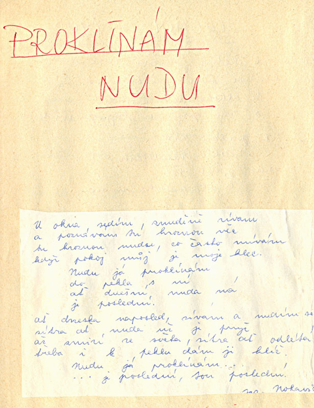 Možná to byla má netrpělivost, možná lenost, možná nechuť učit se zpaměti jen cizí písně způsobilo, že jsem si velmi brzy po zvládnutí několika základních akordů začal skládat sám pro sebe své vlastní neumělé písničky. Má drzost byla v tomto směru nebetyčná. Jedním z prvních akordů, který jsem svými prsty poskládal na hmatníku bylo Ami. Všichni, kdo hrajete na kytaru, víte, jak jednoduchý až banální je přechod z Ami na C dur. Prostě prsteníček levé ruky přesunete na vedlejší strunu A. A já, jen co jsem to zvládl, už jsem měl písničku. Když pominu její hudební kvality, udivuje mne hlavně po těch letech téma, které jsem si pro ni zvolil. Zpívám o tom, že proklínám nudu.